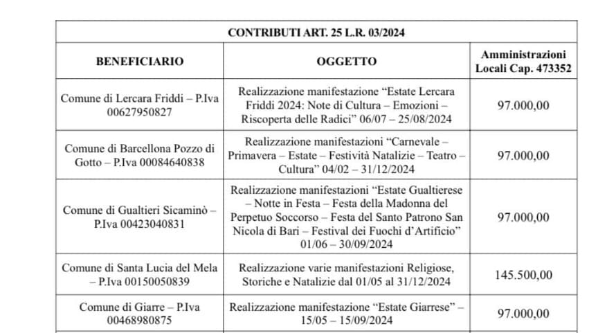 Con D.D.S. n. 312/S6, il Dirigente del Servizio, Dott. Giuseppe Librizzi, ha predisposto gli atti per i contributi art.25 l.r.03/2024. A beneficiarne sono stati numerosi Comuni, tutti con lo stesso importo di 97 mila euro ciascuno, ad eccezione, per esempio, del piccolissimo Comune di Santa Lucia del Mela, che ha ottenuto 145.500,00 € per la realizzazione di varie feste religiose, storiche e natalizie (come si può leggere nel dettaglio).