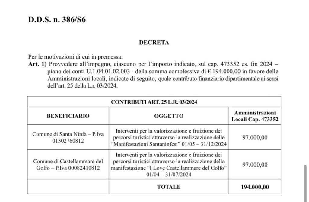 Passiamo all’altrettanto piccolo comune di Santa Ninfa nel trapanese. Con D.D.S. n. 386/S6 a suo favore arriveranno dalla Regione ben 97.000,00 € per interventi per la valorizzazione e fruizione dei percorsi turistici attraverso la realizzazione delle “Manifestazioni Santaninfesi” dal 1° maggio al 31 dicembre di quest’anno (come potete leggere nel dettaglio allegato).