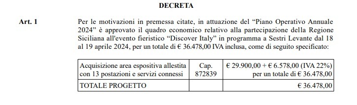 Con D.D.G. n. 414/S11 Serv.11, in attuazione del “Piano Operativo Annuale 2024” è approvato il quadro economico relativo alla partecipazione della Regione Siciliana all’evento fieristico “Discover Italy” in programma a Sestri Levante dal 18 al 19 aprile 2024, per un totale di € 36.478,00 per 13 postazioni e servizi connessi, come di seguito specificato nel dettaglio.