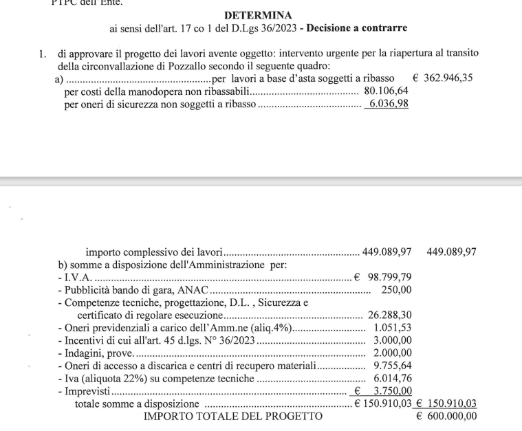 E’ stato avviato l’iter dal Libero Consorzio comunale di Ragusa per la Gara d’appalto dei lavori necessari per l’apertura urgente della Circonvallazione di Pozzallo. Come potete vedere dal documento allegato all’articolo del 25 luglio, si tratta di ben 600 mila euro e l’incarico della progettazione di tale intervento è stato affidato all’ingegnere Pietro Agnello, il Rup per la realizzazione è l’ingegnere Filippo Agosta.