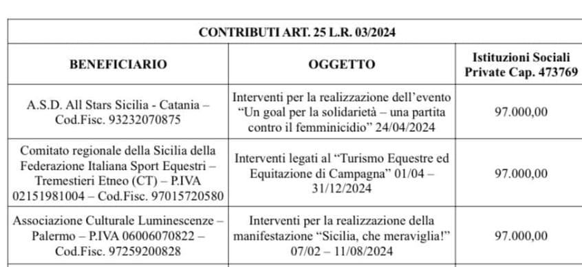 In totale con questo decreto, l’Assessorato regionale, quindi noi cittadini, abbiamo elargito fondi per quasi un Milione di euro. Tra i beneficiari di ben 97.000,00 € c’è l’Associazione “A.S.D. All Stars Sicilia” che ha organizzato ‘Un goal per la solidarietà-Una partita contro il femminicidio’. In tal senso, è d’obbligo ricordarci che, con tale contributo, tutti noi Siciliani abbiamo un cuore d’oro.